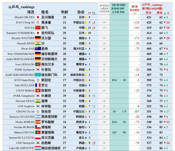 台北小将高承睿减掉155个积分,下滑了14个名次,世界排名第62名。薛飞减掉了165个积分,下滑的16个名次来到了第63名。德国选手沃尔瑟下滑了20个名次,减掉171个积分,世界排名第65名。台北小将张佑安打进亚洲杯半决赛,拿到了107个积分之后世界排名上升27位,来到了第79名。