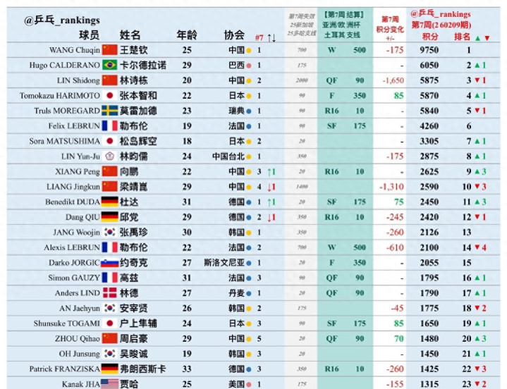 梁靖崑减掉了1310个积分,排名下滑了三位,来到了第十名。向鹏排名上升了三位,来到了世界第九。梁靖崑由于最近一段时间连续受伤,退出了亚洲杯的赛事。之前虽然参加了多哈冠军赛和球星挑战赛,但是都是提前出局,看来伤病对他的困扰还是挺大的。